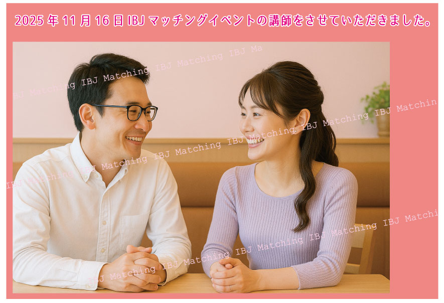 2025年6月,7月 IBJマッチング様主催イベントの講師を務めさせていただきました。ご参加のみなさまの素敵な出会いに立ち会うことができて光栄です!ご興味のある方は、チェックしてみてください→IBJ Matching